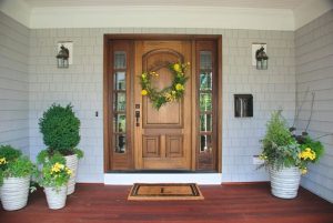 Colonial home with cedar shingles front door in New York