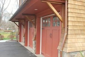 Shingle style home garage in NY by DeMotte Architects